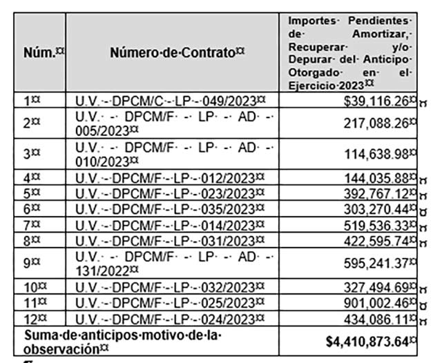 El importe total de anticipos otorgados a los contratos observados durante el ejercicio 2023 pendientes de recuperar y/o de amortizar fue el motivo de la observación, que a la fecha se encuentran amortizados. Esto es, de acuerdo con el criterio que utilizó el auditor es que los anticipos debieron ser ejecutados al cierre del término de las obras; sin embargo, hay situaciones de obra que implica ampliar los plazos de términos de contratación, es decir, se trataba de falta de documentación misma que se presentó de manera espontánea y las empresas cumplieron con la entrega de obra.
