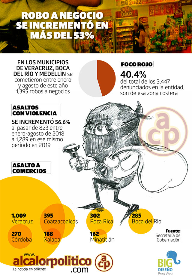 En los municipios de Veracruz, Boca del Río y Medellín se cometieron entre enero y agosto de este año 1,395 robos a negocios.