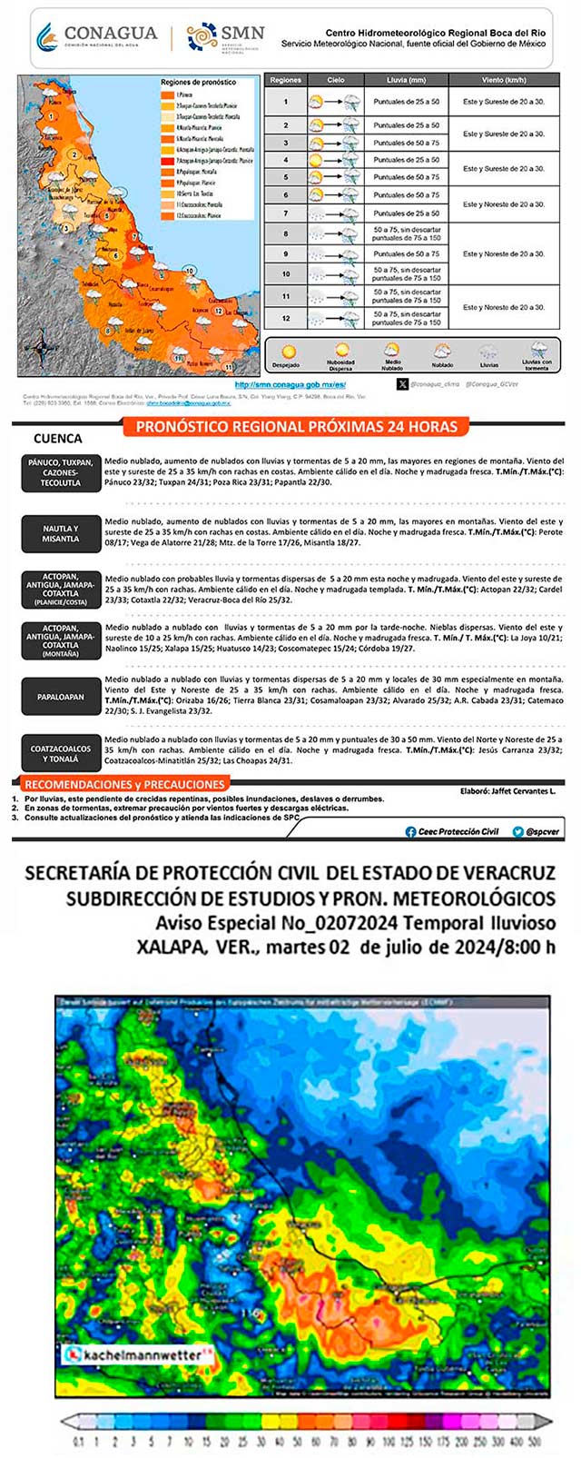 Una vaguada se localiza en el suroeste del Golfo de México y la onda tropical número 7 cruza el oriente de la Península de Yucatán. En Veracruz favorecen un miércoles medio nublado a nublado con lluvias y tormentas matutinas en llanuras y costas, vespertinas a nocturnas en montaña, se estiman acumulados de 5 a 20 milímetros y puntuales de 30 a 50 milímetros.