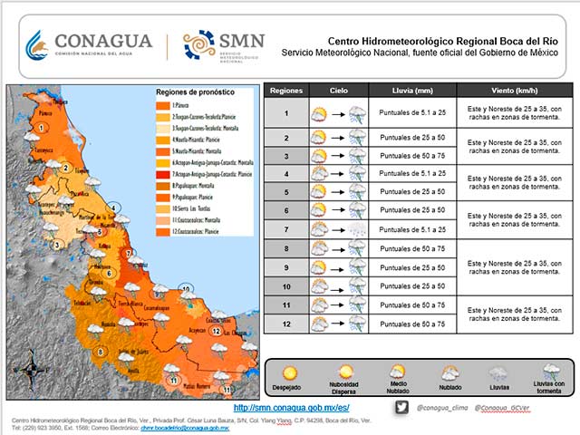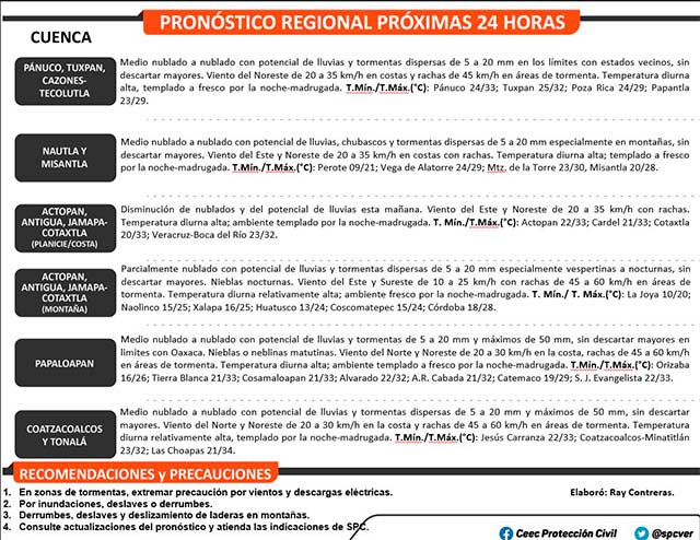 Los efectos de un canal de baja presión que se extiende a lo largo de la vertiente oriental del país en combinación con el ingreso de humedad, el calentamiento diurno y un patrón de divergencia en la atmósfera superior favorecerán el desarrollo de nublados con probabilidad para lluvias puntuales muy fuertes (50 a 75 mm) en las cuencas de los ríos Tonalá, Coatzacoalcos y Papaloapan, así como en zonas montañosas del Cazones y Tecolutla; lluvias puntuales fuertes (25 a 50 mm) en zonas montañosas del Tuxpan, Nautla y Jamapa, además de Los Tuxtlas; lluvias con intervalos de chubascos (5.1 a 25 mm) en el resto de la entidad veracruzana.