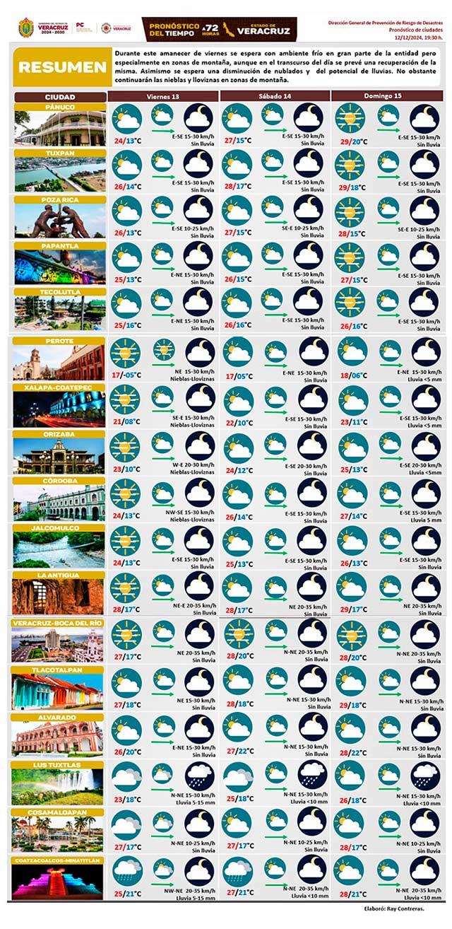Viernes con ambiente frío en gran parte de la entidad, pero especialmente en zonas de montaña, aunque en el transcurso del día se prevé una recuperación de la temperatura. Asimismo, se espera disminución de nublados y del potencial de lluvias. No obstante, siguen nieblas y lloviznas en zonas de montañas.
