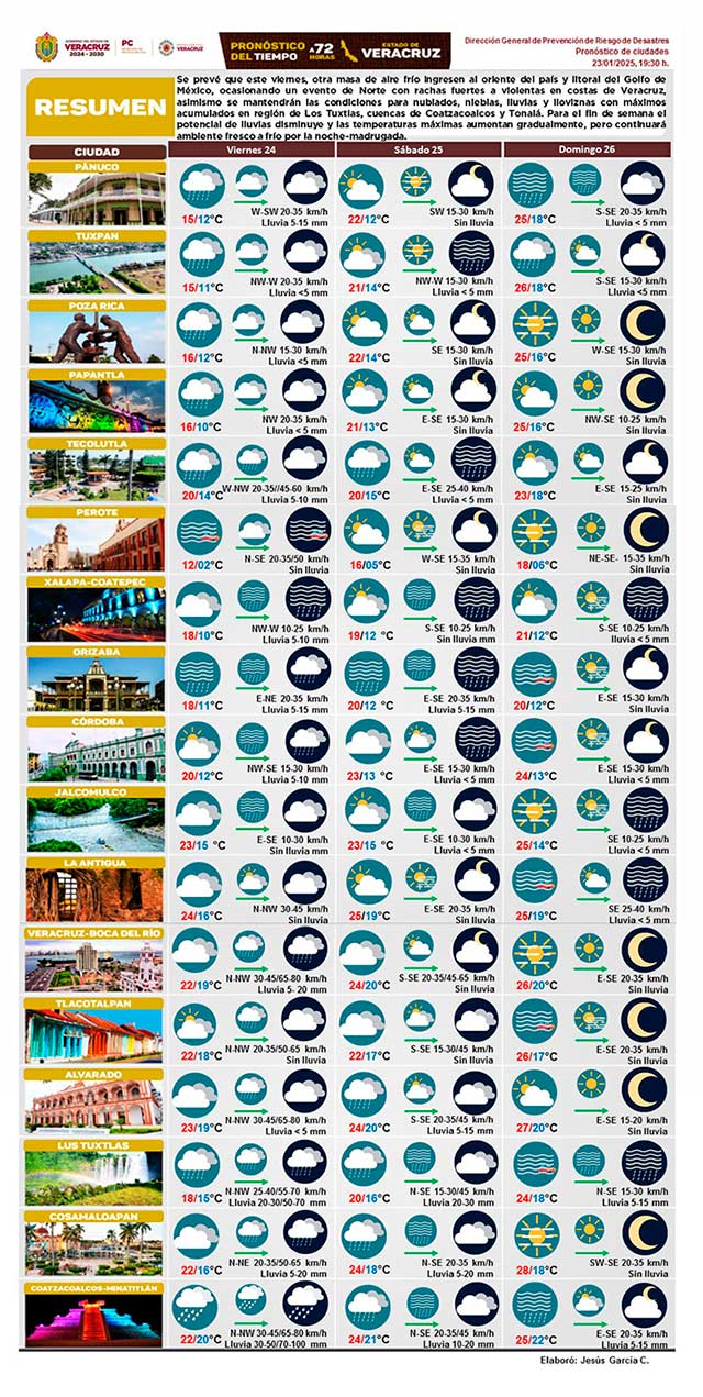 Se prevé que este viernes otra masa de aire frío ingrese al litoral del Golfo de México ocasionando “norte” con rachas fuertes a violentas en costas de Veracruz. Nublados, nieblas, lluvias y lloviznas con máximos acumulados en Los Tuxtlas, cuencas de Coatzacoalcos y Tonalá. El fin de semana potencial de lluvias disminuye y aumenta temperatura; frío por la noche-madrugada.