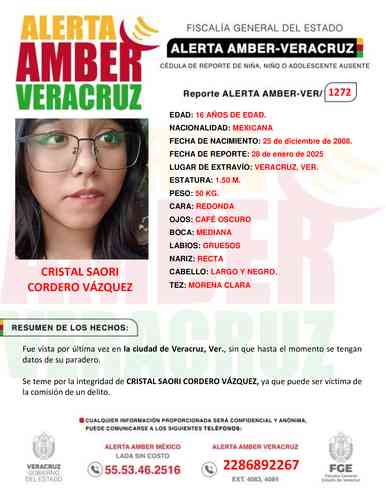 El programa Alerta Amber Veracruz, solicita su colaboración para la ACTIVACIÓN de la ALERTA AMBER- VERACRUZ 1272 por la adolescente CRISTAL SAORI CORDERO VÁZQUEZ  de 16 años de edad.