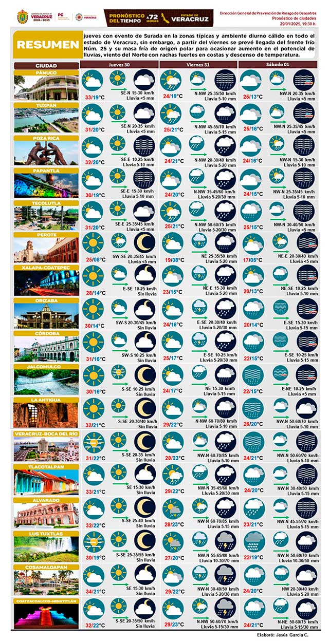 Jueves con surada en las zonas típicas y ambiente diurno cálido en todo el estado de Veracruz. Sin embargo, a partir del viernes se prevé llegada del frente frío 25 y su masa de aire frío de origen polar que ocasionarán aumento de lluvias, viento del norte con rachas fuertes en costas y descenso de temperatura.