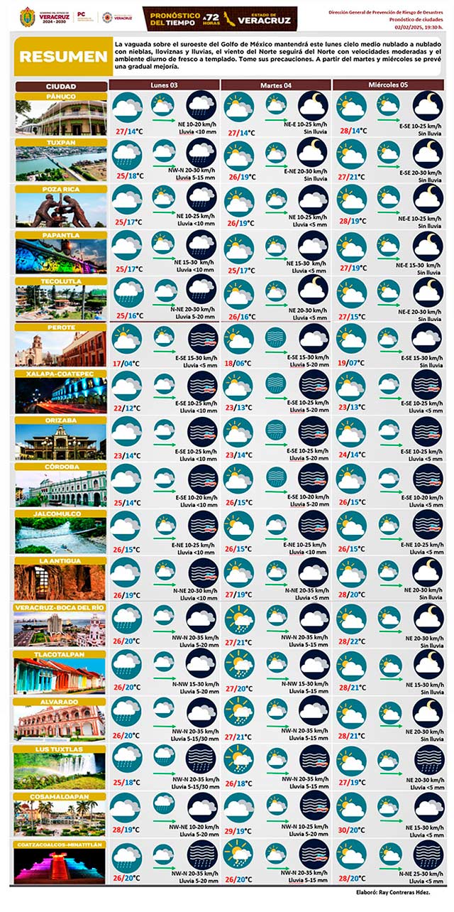 La vaguada sobre el suroeste del Golfo de México mantendrá este lunes cielo medio nublado a nublado con nieblas, lloviznas y lluvias, el viento seguirá siendo del norte con velocidades moderadas y el ambiente diurno de fresco a templado. Tome sus precauciones. A partir del martes y miércoles se prevé gradual mejoría.