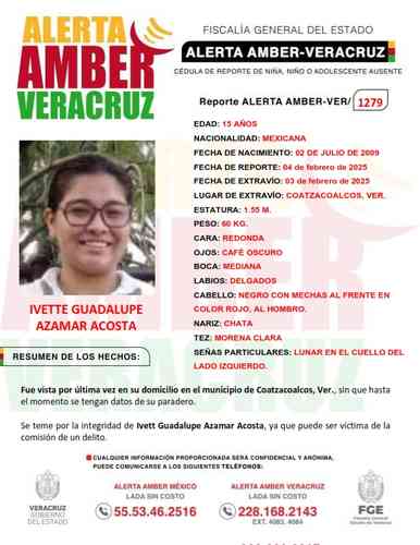El programa Alerta Amber Veracruz, solicita su colaboración para la ACTIVACIÓN de la ALERTA AMBER- VERACRUZ 1279 por la adolescente Ivett Guadalupe Azamar Acosta de 15años de edad.