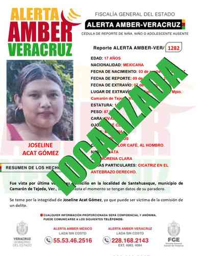 El programa Alerta Amber Veracruz, solicita su colaboración para la DESACTIVACIÓN de la ALERTA AMBER- VERACRUZ 1282 por la adolescente Joseline Acat Gómez, de 17 años.