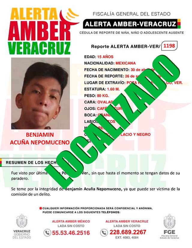 El programa Alerta Amber Veracruz, solicita su colaboración para laDESACTIVACIÓNde la ALERTA AMBER- VERACRUZ 1198 por el adolescente BENJAMÍN ACUÑA NEPOMUCENO de 15 años.