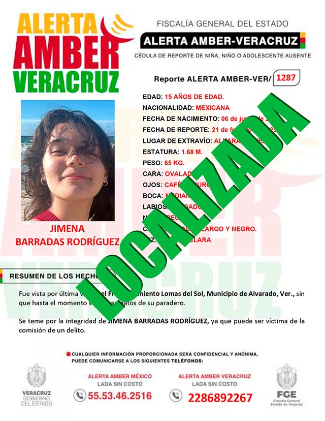 DESACTIVACIÓNde la ALERTA AMBER- VERACRUZ 1287 por la adolescente JIMENA BARRADAS RODRIGUEZ de 15 años de edad.