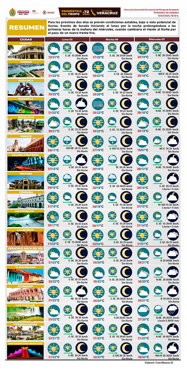 Para los próximos 2 días se prevén condiciones estables, bajo o nulo potencial de lluvias. Surada, iniciando el lunes por la noche, prolongándose a las primeras horas de la mañana del miércoles cuando cambiaría el viento al norte por el paso de un nuevo frente frío.