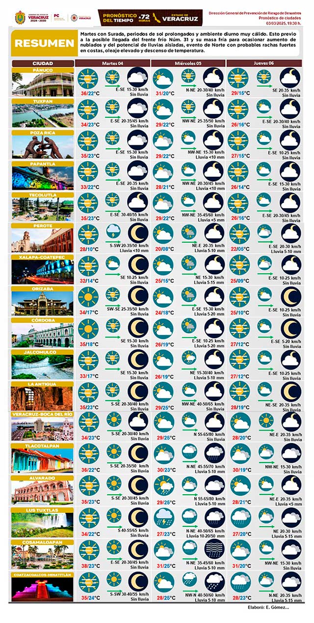 Martes con surada, periodos de sol prolongados y ambiente diurno muy cálido. Esto previo a la posible llegada del frente frío número 31 y su masa fría para ocasionar aumento de nublados y del potencial de lluvias aisladas, evento de “norte” con probables rachas fuertes en costas, oleaje elevado y descenso de temperatura.