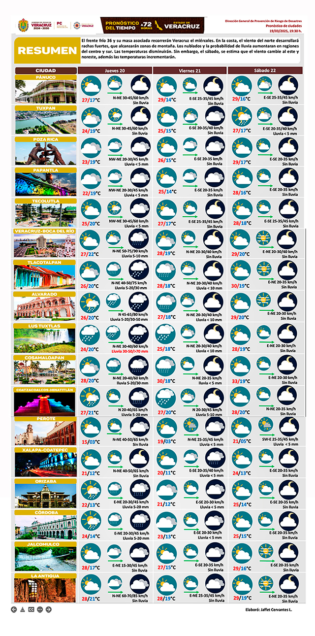 El frente frío 36 y su masa asociada recorrerán Veracruz el jueves. En la costa el viento del norte desarrollará rachas fuertes que alcanzarán zonas de montaña. Aumenten nublados y probabilidad de lluvia en centro y sur. Temperaturas disminuirán. Sin embargo, el sábado viento cambia al este y noreste, además temperaturas incrementarán.