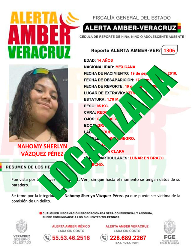 El programa Alerta Amber Veracruz, solicita su colaboración para la DESACTIVACIÓN de la ALERTA AMBER- VERACRUZ 1306 por la adolescente NAHOMY SHERLYN VÁZQUEZ PÉREZ de 14 años.