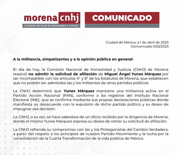La Comisión Nacional de Honestidad y Justicia (CNHJ) de MORENA resolvió este martes no admitir la solicitud de afiliación del senador Miguel Ángel Yunes Márquez, al considerar que es incompatible con los artículos 4º y 6º de los Estatutos del partido, los cuales prohíben el ingreso de militantes de otras fuerzas políticas.