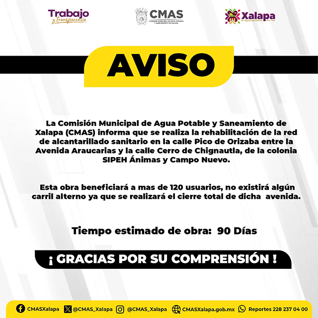 Xalapa, Ver., 2 de abril de 2025.- CMAS Xalapa informó sobre el cierre de la calle Pico de Orizaba, entre la avenida Araucarias y Cerro de Chignautla, por la rehabilitación de la red de alcantarillado. Estiman que los trabajos duren 90 días.