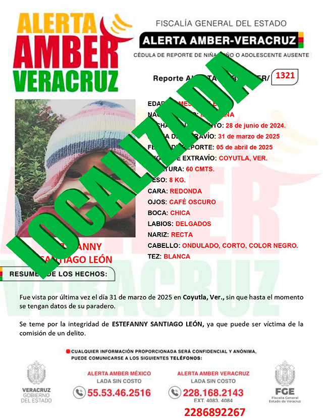El programa Alerta Amber Veracruz, solicita su colaboración para laDESACTIVACIÓNde la