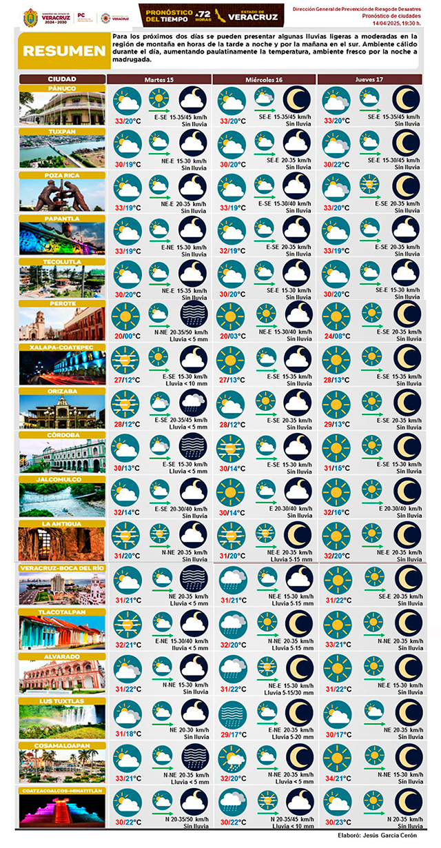 Para los próximos 2 días se pueden presentar algunas lluvias ligeras a moderadas en la región de montaña en horas de la tarde a noche y por la mañana en el sur. Ambiente cálido durante el día, aumentando paulatinamente la temperatura, ambiente fresco por la noche a madrugada.