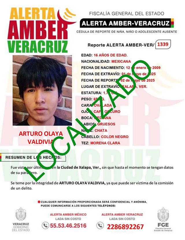 DESACTIVACIÓN de la ALERTA AMBER- VERACRUZ 1339 por el adolescente ARTURO OLAYA VALDIVIA.