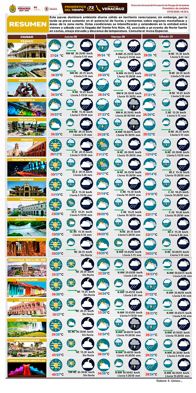 Este jueves dominará ambiente diurno cálido en Veracruz; por la tarde se prevé aumento en potencial de lluvias y tormentas sobre regiones montañosas y zona norte. Esto se intensificará y extenderán entre viernes y sábado con llegada del frente frío 42, asociado a “norte” fuerte en costas con oleaje elevado y descenso de temperatura.
