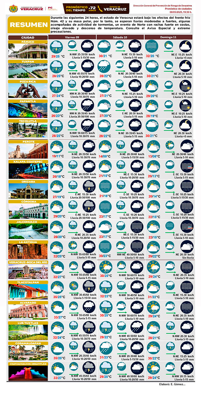 Durante las siguientes 24 horas, el estado de Veracruz estará bajo los efectos del frente frío 42 y su masa polar, por lo tanto, se esperan lluvias moderadas a fuertes, algunas acompañadas de actividad de tormentas, un evento de “norte” con rachas fuerte en costas, oleaje elevado y descenso de temperatura. Consulte el Aviso Especial y extreme precauciones.