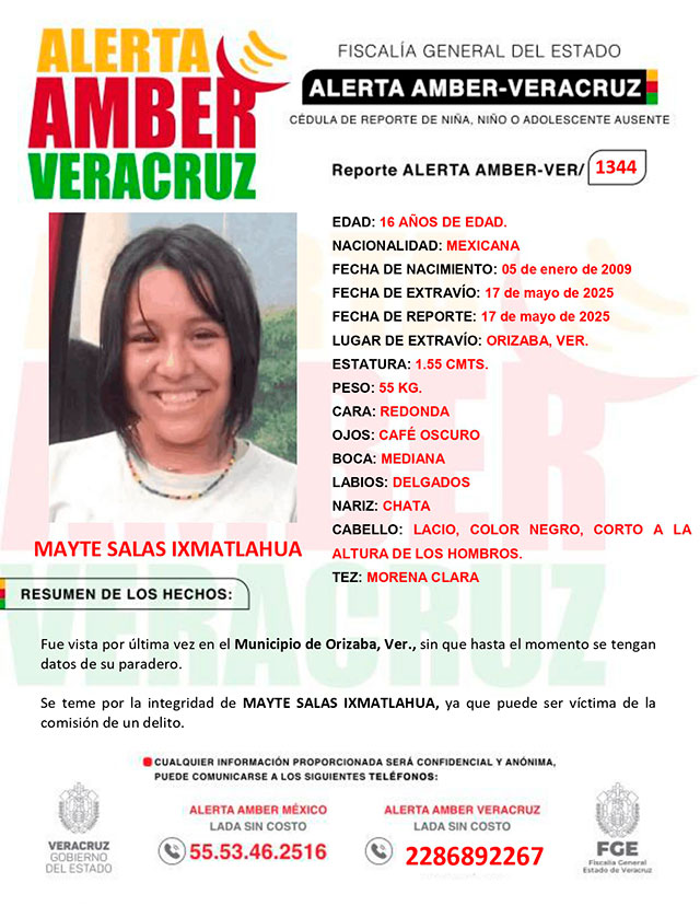 El programa Alerta Amber Veracruz, solicita su colaboración para la ACTIVACIÓN de la ALERTA AMBER- VERACRUZ 1344 por la adolescente MAYTE SALAS IXMATLAHUA de 16 años de edad.