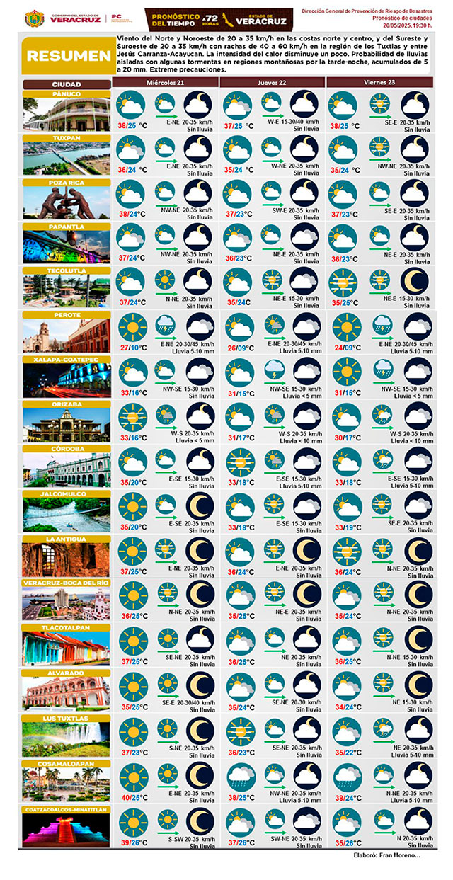 Viento del norte y noroeste de 20 a 35 kilómetros por hora en costas norte y centro, y del sureste y suroeste de 20 a 35 kilómetros por hora con rachas en Los Tuxtlas y Jesús Carranza-Acayucan. Intensidad del calor disminuye un poco. Probables lluvias aisladas con algunas tormentas en regiones montañosas por la tarde-noche.