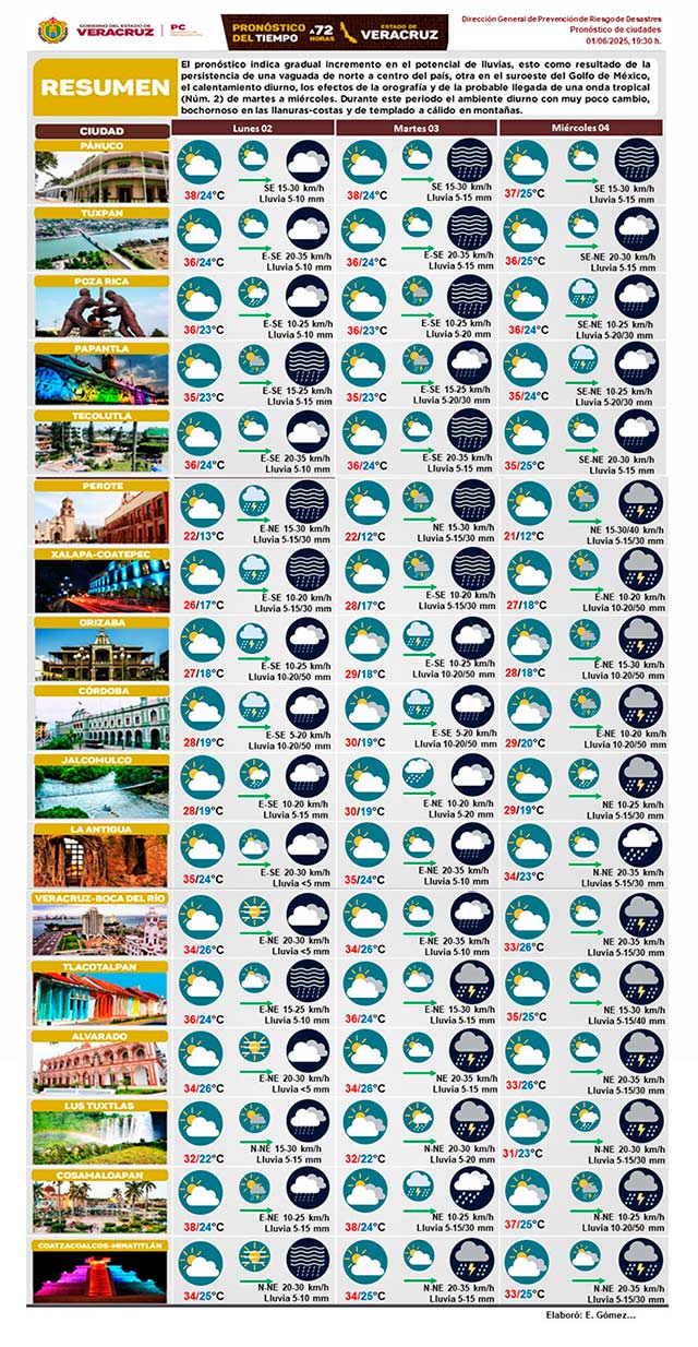 Gradual incremento el potencial de lluvias como resultado de la persistencia de una vaguada de norte a centro del País, otra en el suroeste del Golfo de México, el calentamiento diurno, los efectos de la orografía y la probable llegada de una onda tropical (número 2) de martes a miércoles. En este periodo ambiente diurno con muy poco cambio, bochornoso en llanuras-costas y de templado a cálido en montañas.