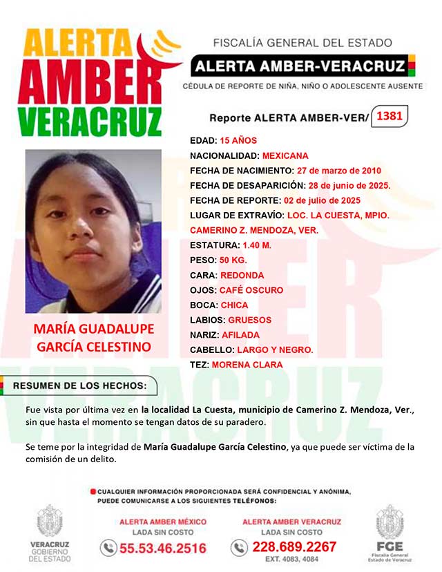 El programa Alerta Amber Veracruz, agradece su colaboración e informa la ACTIVACIÓN de la ALERTA AMBER- VERACRUZ 1381 por la adolescente María Guadalupe García Celestino, de 15 años de edad.