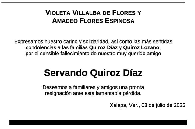 Condolencias de la familia Flores Villalba por el deceso del Señor Servando Quiroz Díaz