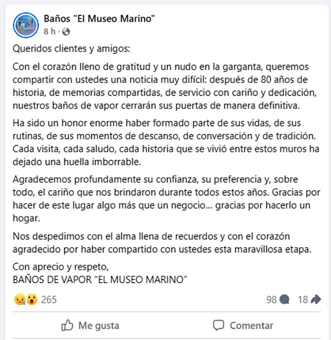 Con el nudo en la garganta, herederos de los baños de vapor, El Museo Marino, de la calle Guerrero, se despidieron este lunes de su clientela al publicar en redes sociales el cierre definitivo del que fue por 80 años, no sólo un negocio sino un sitio de encuentro para mucha gente.