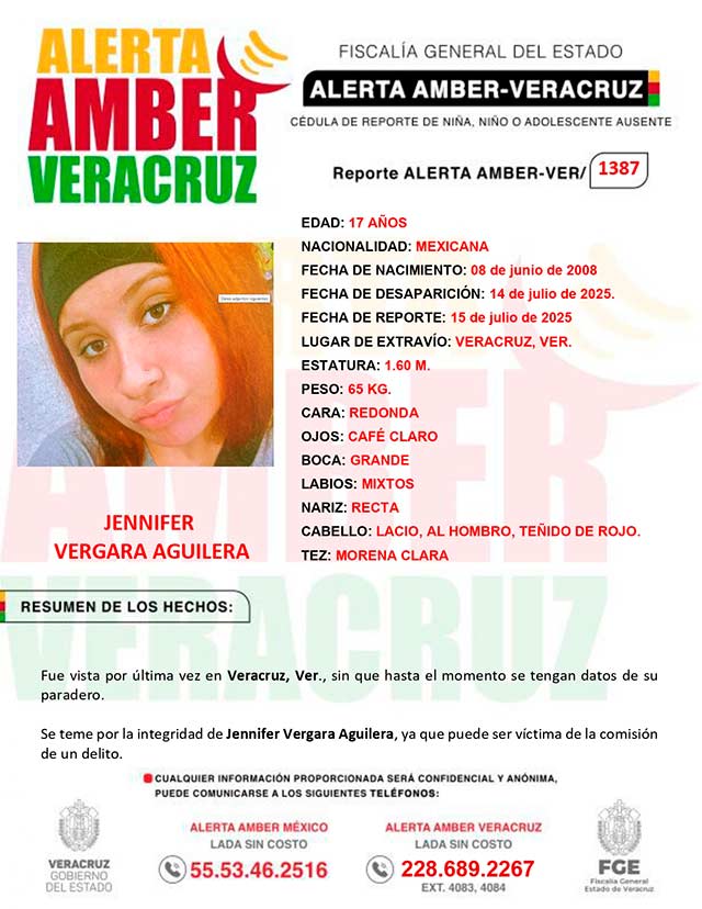 El programa Alerta Amber Veracruz, agradece su colaboración e informa la ACTIVACIÓN de la ALERTA AMBER- VERACRUZ 1387 por la adolescente Jennifer Vergara Aguilera, de 17 años de edad.