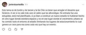 Desde su cuenta en Threads, Duarte calificó la obra como una “estupidez mal planificada”. Cuestionó el lugar donde se realizó la construcción –una zona saturada por el crecimiento urbano– y advirtió que la falta de espacios adecuados para estacionamiento genera caos cada vez que hay un evento deportivo. “A ver si no sale más caro el caldo que las albóndigas”, escribió Duarte. Y remató: “Este tema es de Tontín y de Tarzán y la tía Chío va a tener que arreglar el desastre que hicieron”.