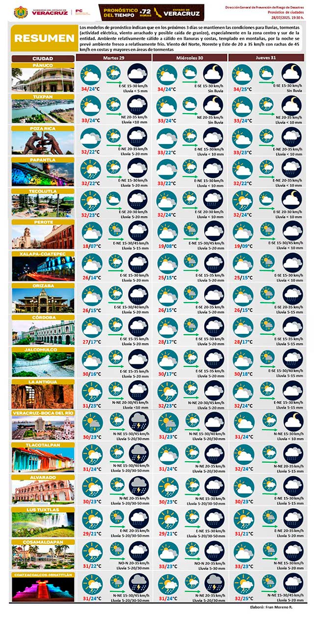 En próximos 3 días se mantienen condiciones para lluvias, tormentas (actividad eléctrica, viento arrachado y posibles granizadas) especialmente en la zona centro y sur. Ambiente cálido en llanuras y costas, templado en montañas. Por la noche ambiente fresco a frío. Viento del norte, noreste y este de 20 a 35 kilómetros por hora con rachas de 45 kilómetros por hora en costas y mayores en áreas de tormenta.