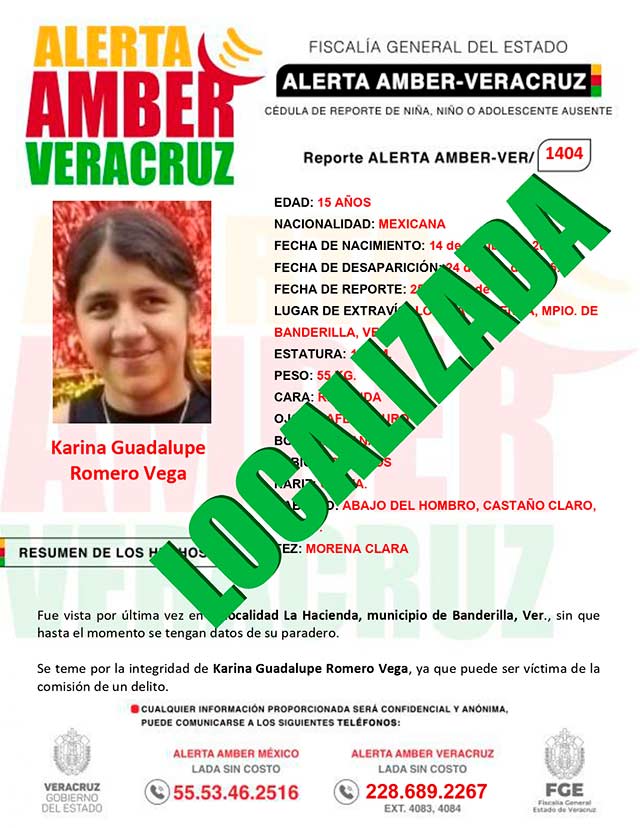 El programa Alerta Amber Veracruz, agradece su colaboración e informa la DESACTIVACIÓN de la ALERTA AMBER- VERACRUZ 1404 por la adolescente Karina Guadalupe Romero Vega de 15 años de edad.