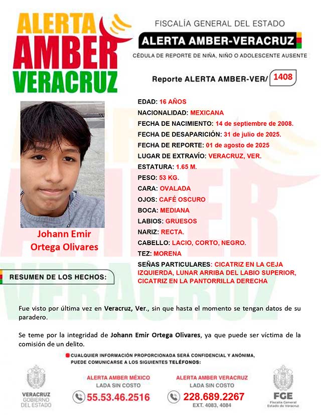 El programa Alerta Amber Veracruz, agradece su colaboración e informa la ACTIVACIÓN de la ALERTA AMBER- VERACRUZ 1408 por el adolescente Johann Emir Ortega Olivares, de 16 años de edad.