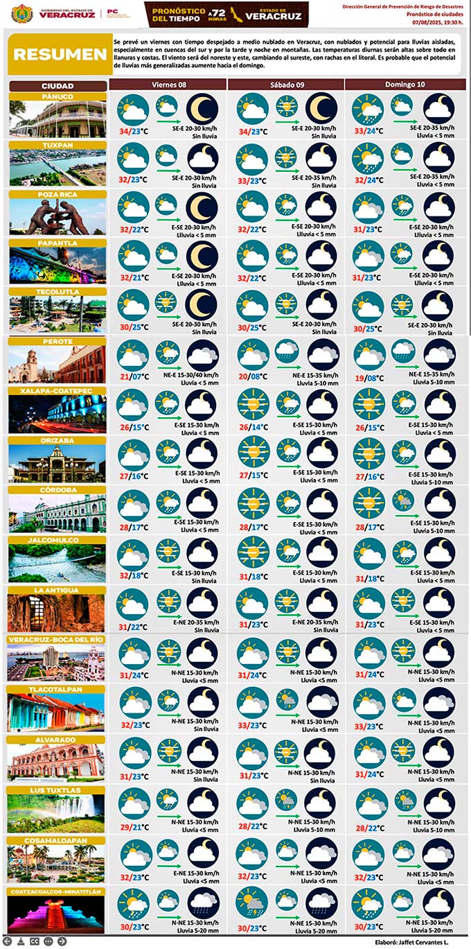 Viernes con tiempo despejado a medio nublado en Veracruz, con nublados y potencial para lluvias aisladas, especialmente en cuencas del sur y por la tarde y noche en montañas. Las temperaturas diurnas altas, sobre todo en llanuras y costas. Viento con rachas en el litoral. Probable que potencial de lluvias más generalizadas aumente hacia el domingo.