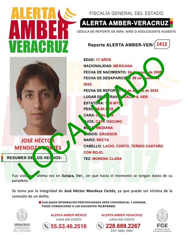 El programa Alerta Amber Veracruz, agradece su colaboración e informa la DESACTIVACIÓN de la ALERTA AMBER- VERACRUZ 1412 por el adolescente José Héctor Mendoza Cortés, de 17 años de edad.