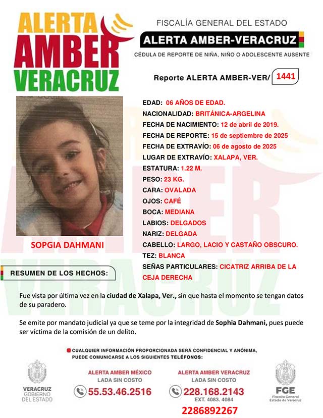 El programa Alerta Amber Veracruz, agradece su colaboración e informa la Activación de la ALERTA AMBER- VERACRUZ 1441 por la niña Sophia Dahmani de 6 años de edad.