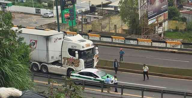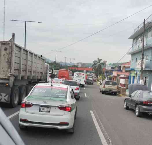 Xalapa, Ver., 26 de septiembre de 2025.- Tráfico vehicular detenido hacia Las Trancas en el bulevar Xalapa-Banderilla por choque entre tráiler y taxi en el puente Macuiltépetl. Automovilista no pueden tomar la lateral de este puente como vía alterna pues lleva meses cerrada por el deslave del muro de contención.