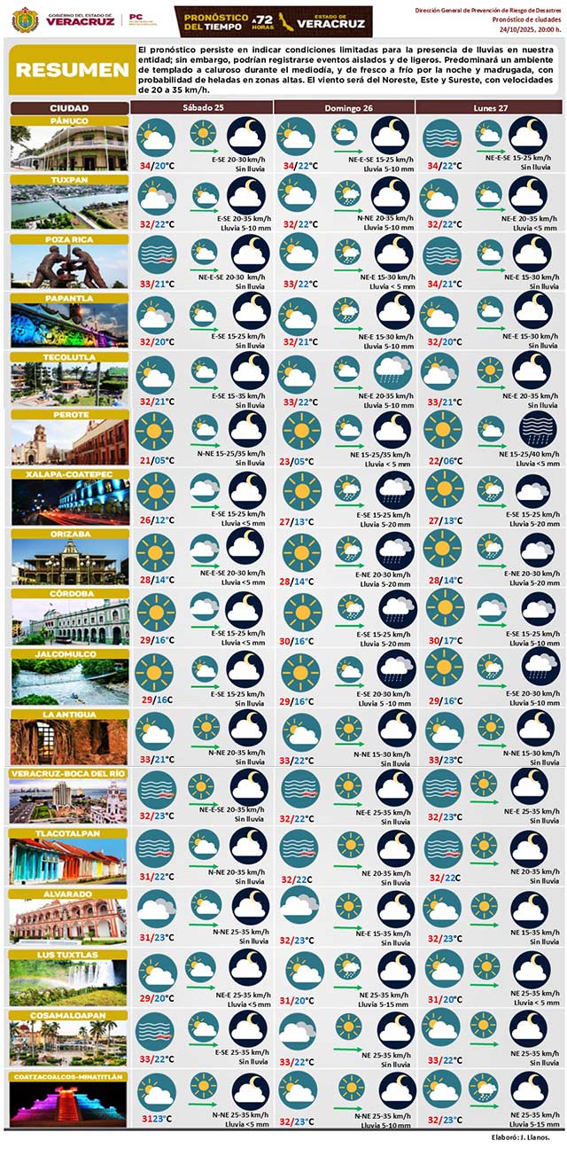 Condiciones limitadas para lluvias; sin embargo, podrían registrarse eventos aislados y ligeros. Ambiente de templado a caluroso durante mediodía y de fresco a frío por la noche-madrugada, con probabilidad de heladas en zonas altas. Viento del noreste, este y sureste con velocidades de 20 a 35 kilómetros por hora.