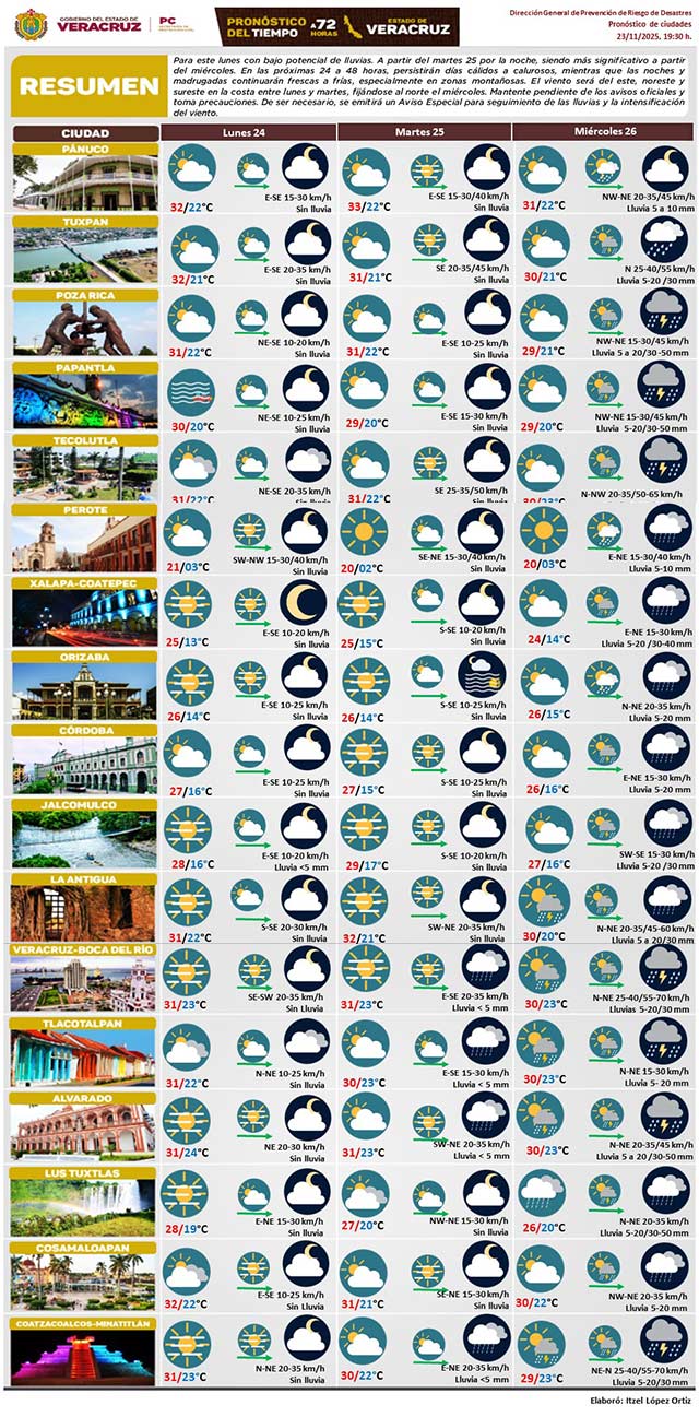 Para este lunes, potencial de lluvia seguirá bajo. A partir del martes 25 por la noche aumentará gradualmente, sobre todo a partir del miércoles. En las próximas 24 a 48 horas persistirán días calurosos, mientras que las noches y madrugadas continuarán frescas a frías, especialmente en zonas montañosas.