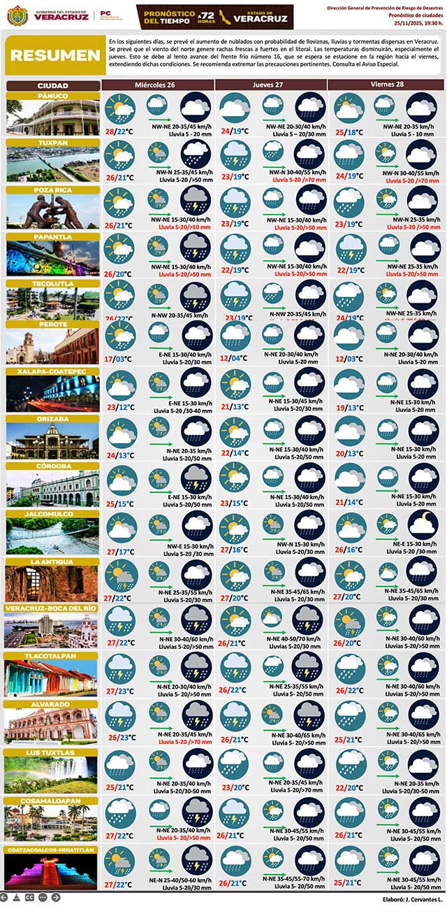 En siguientes días, se prevé probabilidad de lloviznas, lluvias y tormentas dispersas. Viento del norte podría generar rachas frescas a fuertes en el litoral. Las temperaturas disminuirán, especialmente el jueves por el lento avance del frente frío 16, que se espera se estacione en la región hacia el viernes. Se recomienda extremar las precauciones.
