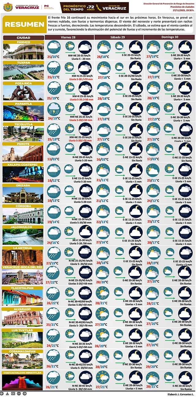 El frente frío 16 continuará su movimiento hacia el sur. Se prevé un viernes nublado, con lluvias y tormentas dispersas. El viento del noroeste y norte con rachas frescas a fuertes que irán decreciendo. Las temperaturas descenderán. El sábado, se estima que el viento cambie al sur y sureste, favoreciendo disminución de lluvias y el incremento de las temperaturas.