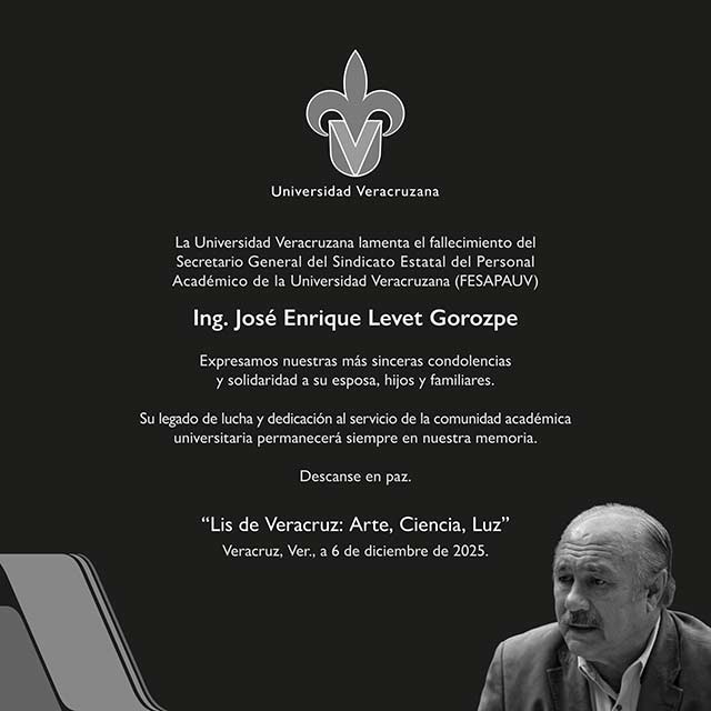 La Universidad Veracruzana lamenta el fallecimiento del Ing. José Enrique Levet Gorozpe, Secretario General del Sindicato Estatal del Personal Académico de esta casa estudios.