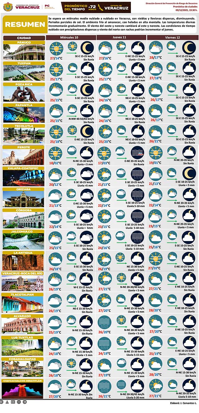 Se espera un miércoles medio nublado con nieblas y lloviznas dispersas que irán disminuyendo. Periodos parciales de sol. Ambiente frío al amanecer, con heladas en alta montaña. Las temperaturas diurnas incrementarán gradualmente. Tiempo nublado con precipitaciones dispersas y viento del norte con rachas podrían incrementarse el jueves.