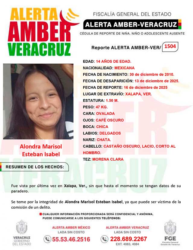 El programa Alerta Amber Veracruz, agradece su colaboración e informa la ACTIVACION de la ALERTA AMBER- VERACRUZ 1504 por la adolescente Alondra Marisol Esteban Isabel de 14 años de edad.