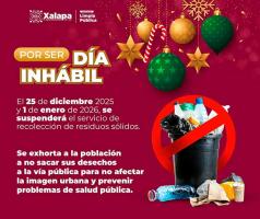 El Ayuntamiento de Xalapa, a través de la Dirección de Limpia Pública, informa a la ciudadanía que por ser días inhábiles, el próximo 25 de diciembre y 1° de enero se suspenderá el servicio de recolección de residuos sólidos.
