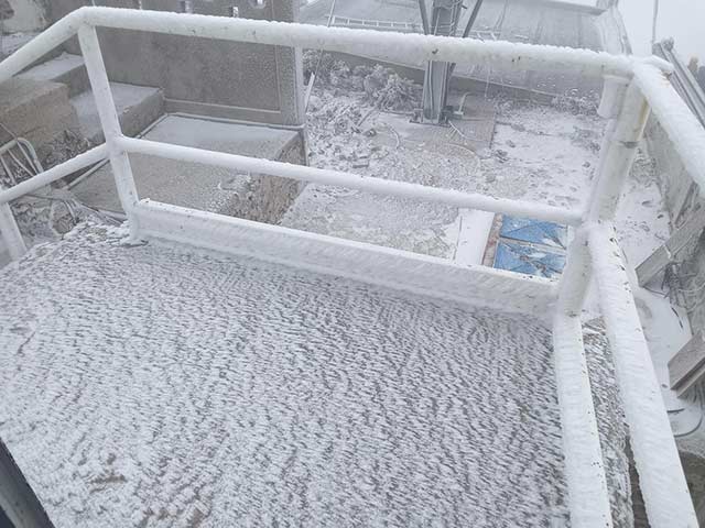 Perote, Ver., 11 de enero de 2026.- En el Cofre de Perote se registraron temperaturas bajo cero, lo que provocó la presencia de cencellada y escarcha. La cencellada ocurre cuando hay niebla y mucho frío: las diminutas gotas de agua se congelan al tocar el suelo, las plantas y las rocas, cubriéndolas de una capa blanca.