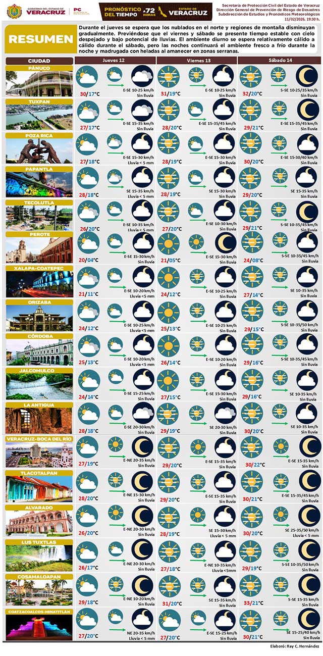 Nublados en norte y regiones de montaña disminuirán gradualmente este jueves. Viernes y sábado bajo potencial de lluvias. Ambiente diurno cálido el sábado, pero las noches continuarán con ambiente frío en la noche-madrugada con heladas al amanecer en zonas serranas.