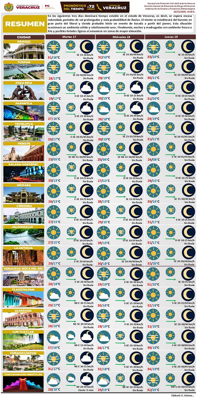Tiempo estable en próximas 72 horas en Veracruz. Escasa nubosidad, periodos de sol prolongados y nula posibilidad de lluvias. Viento del sureste en el litoral y posible surada a partir del jueves. Esto ocasionará ambiente cálido y seco. Pero noches y madrugadas de frescas a frías con posibles heladas al amanecer en zonas muy elevadas.